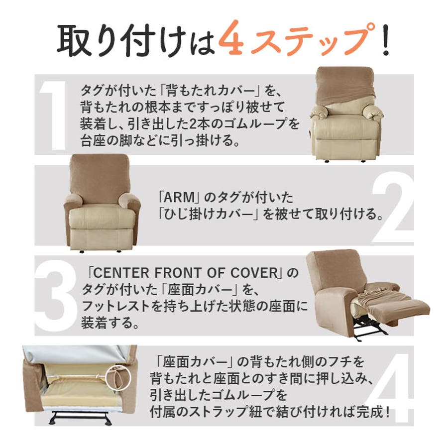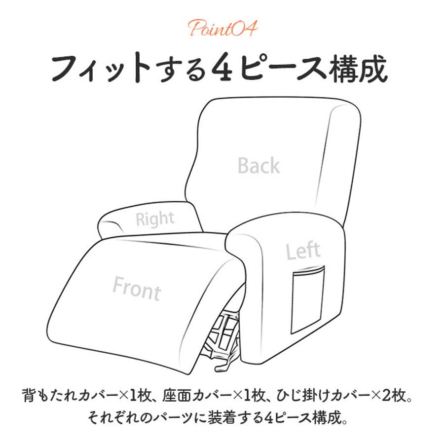 ・背もたれカバー×1枚、座面カバー×1枚、ひじ掛けカバー×2枚。合計4枚のカバーをリクライニングチェアのそれぞれのパーツに装着する4ピース構成。