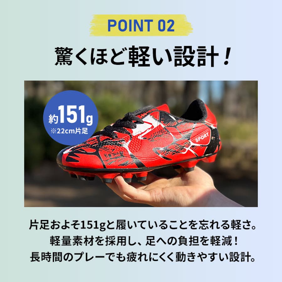 ・軽量素材を使用し、足への負担を軽減。長時間のプレーでも疲れにくい。動きやすさが魅力のサッカーシューズ。
