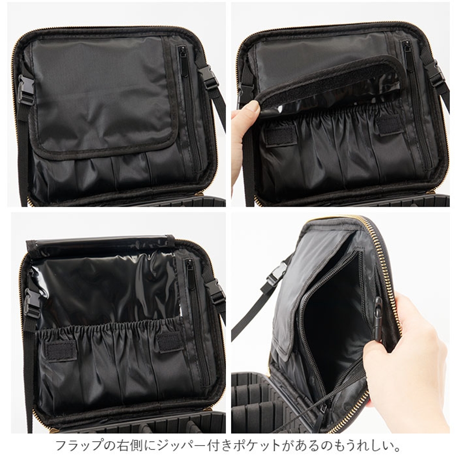・フタのフラップを開くとブラシの収納に便利なポケットを4つ配置。内側はビニール素材でコーティングされており、ブラシに残っているメイクが付いてもサッと拭き取り可能◎