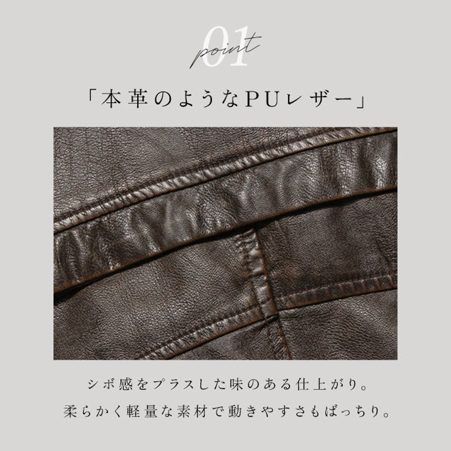 ・柔らかなPUレザー素材を使い、シボ感をプラスした風合いのある仕上がり。ボディラインに心地よく馴染んで、動きやすさもばっちり。本革のような面倒なお手入れは不要!
