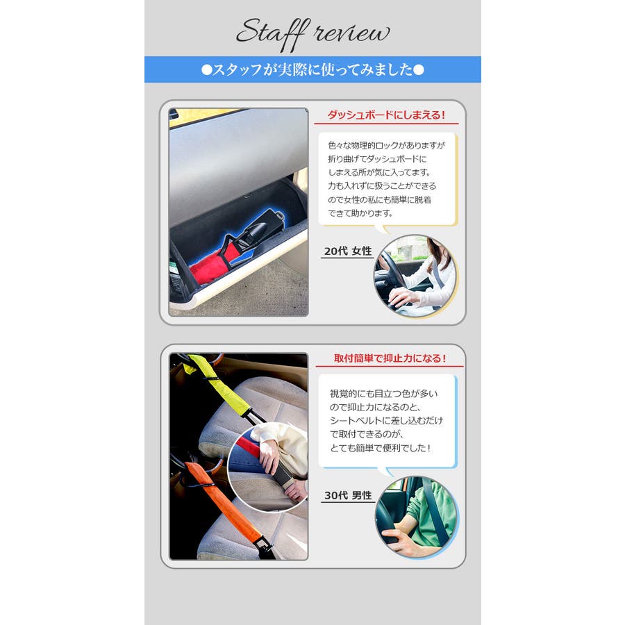 ・シートベルトに装着するので、軽自動車からSUV車まで幅広い車種に対応!左ハンドルにも取り付けOK。