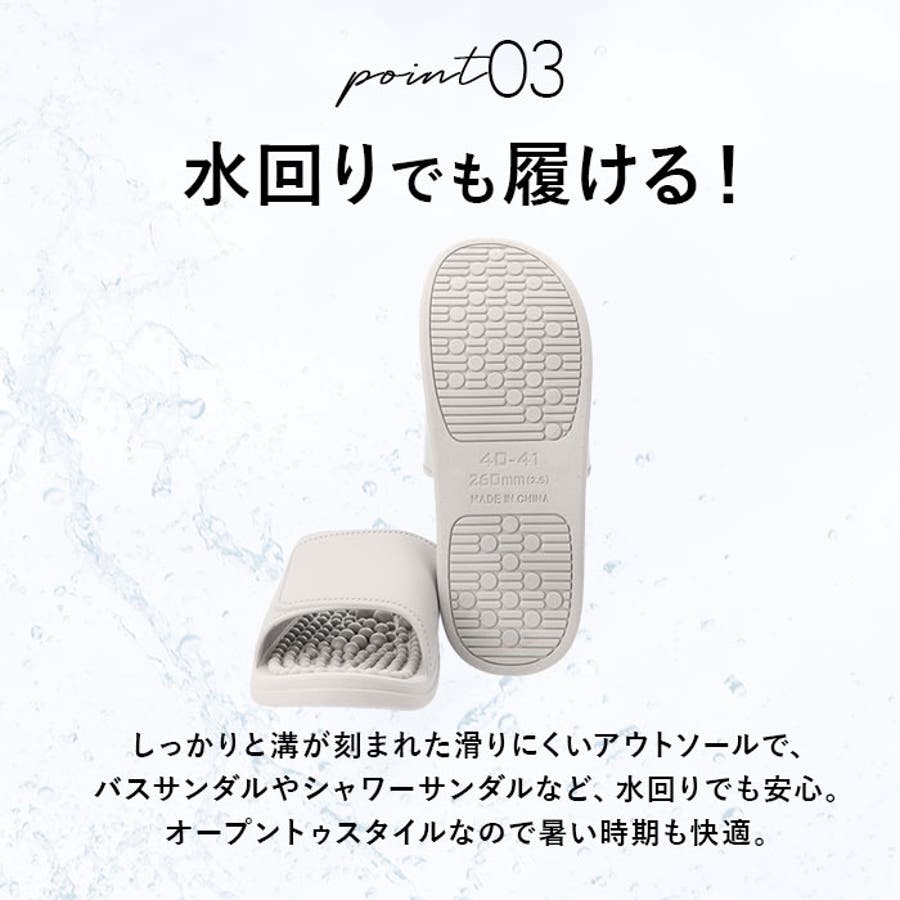 ・しっかりと溝が刻まれた滑りにくいアウトソールで、バスサンダルやシャワーサンダルなど、水回りで使用しても安心。