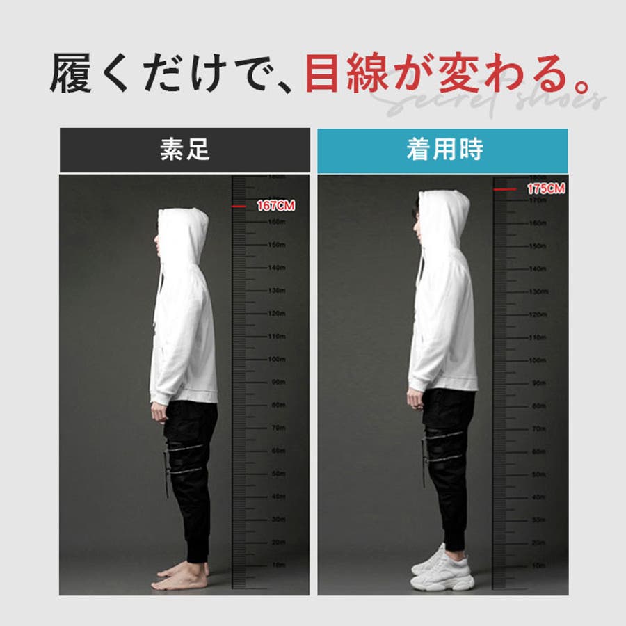 ・厚底のソールで約6cm+インヒール約2.5cmで約8.5cmアップ!!見た目は普通のスニーカー、でも履くだけで身長がUPする優れモノ。
