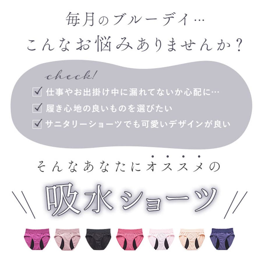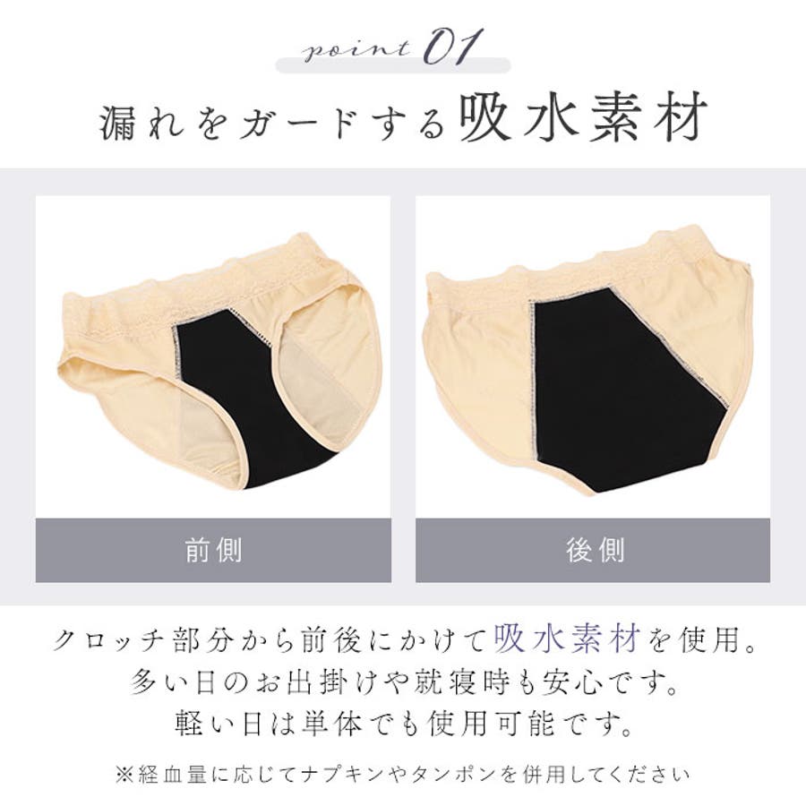 ・クロッチ部分~前後にかけて吸水素材を使用しているから、多い日のお出かけや就寝時にも心地よく過ごせます。軽い日には単独でご使用いただけますが、必要に応じてナプキンやタンポンと併用してください。
