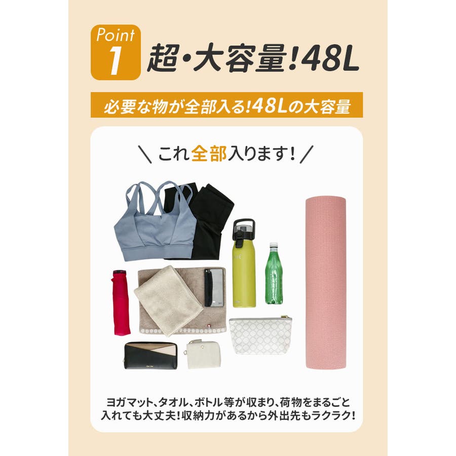 ・メイン収納はノージッパーで出し入れがしやすく、ヨガマットだけでなく、着替えやタオル、シューズなどを楽々収納。