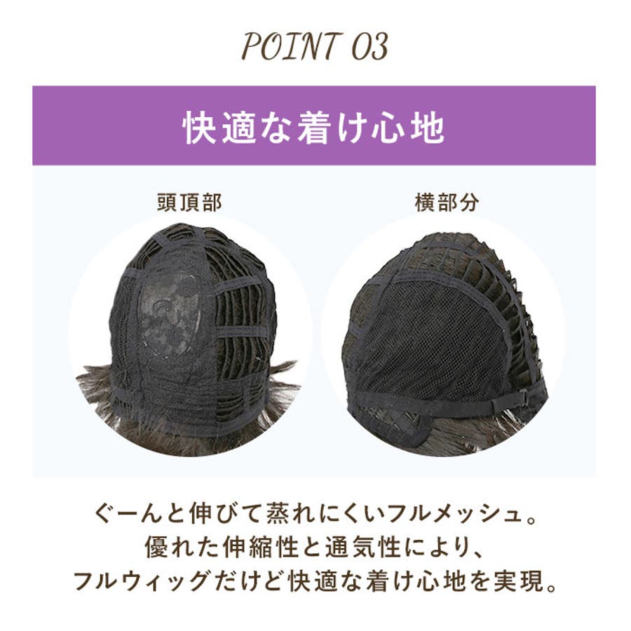・ツヤを軽減した人毛のような細さの耐熱ファイバー100%使用で、ウィッグに見えない自然なスタイルを演出。コテやヘアアイロンの使用もOK!