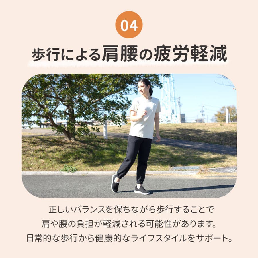 ・今までの歩行スタイルを正しいバランスに導くことで、身体の緊張を緩和し、肩・腰の疲れが軽減(※3)。お買い物や散歩など普段のちょっとした歩行から健康に。