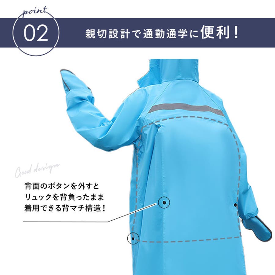 ・背面のスナップボタンを開放することで、リュックを背負ったままでも着用できるワイド背マチ構造。雨の日でも自転車やバイクでの通勤・通学がもっと快適に。