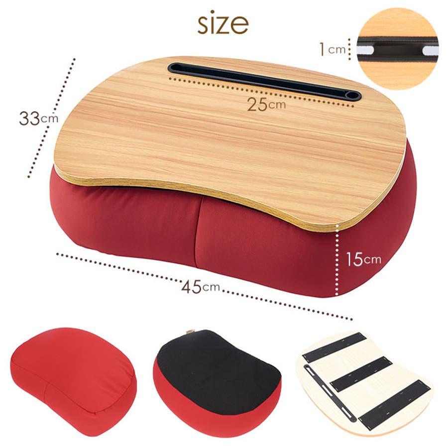 ・テーブル裏の面ファスナーで、クッション裏面に貼り付けるだけ。あっという間に膝の上に乗せるミニテーブルが完成!