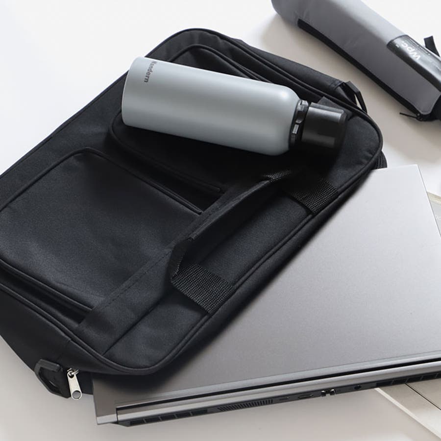 ・メインスペースには底板付きで、書類や書籍など重みのある物も収納出来て、バッグがきちんと自立。マチ広タイプなので、ランチボックスや500mlペットボトルもしっかり収納できる。