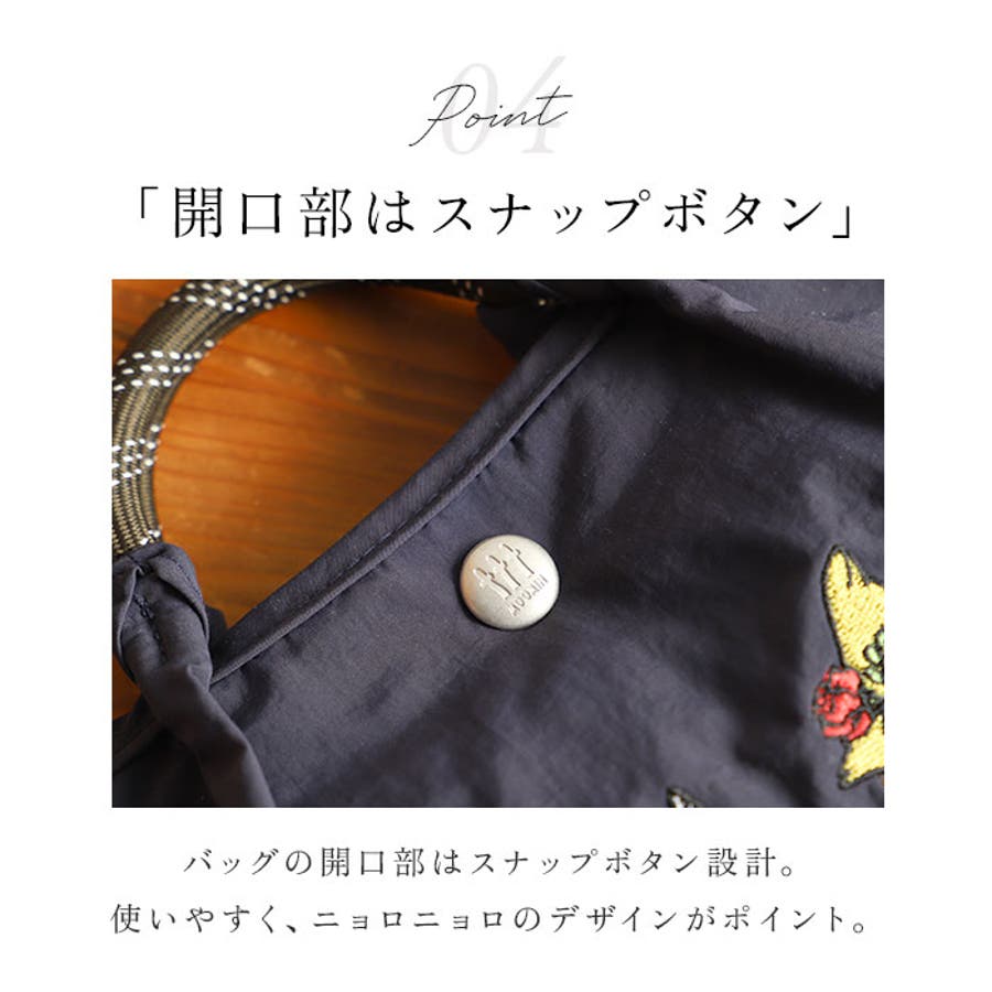 ・開口部はニョロニョロが刻印された、スナップボタン式。サッと開け閉め&飛び出しをガード。