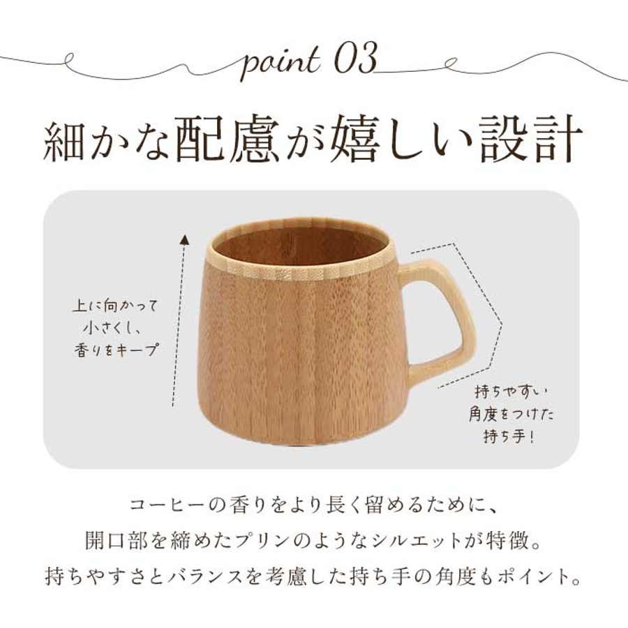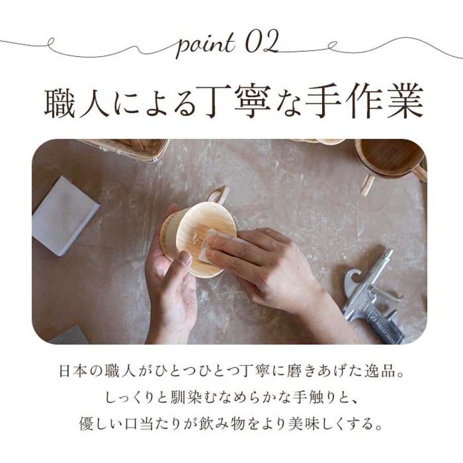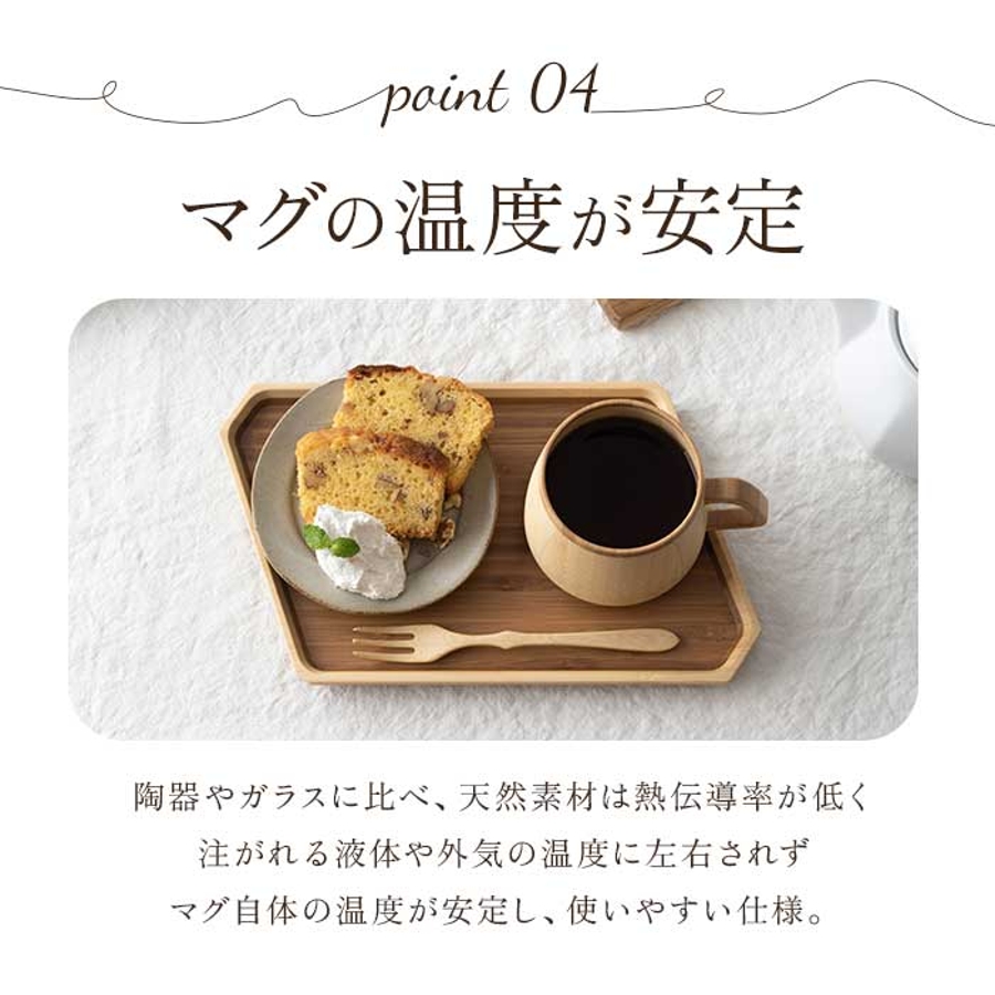・陶器やガラス製品に比べ熱伝導率が低いので、注がれる液体や外気の温度に左右されずマグ自体の温度が安定。