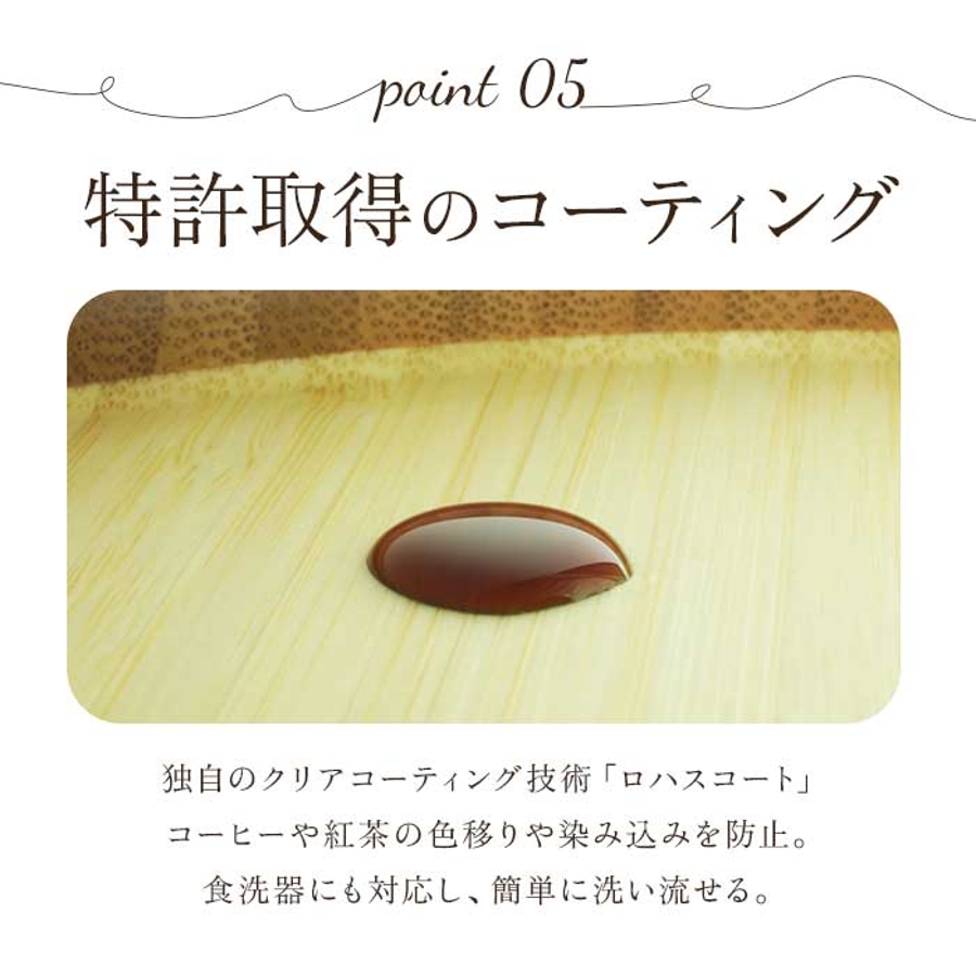 ・素材の内部まで浸透させるコーティング。コーヒなどの色移りや染み込みを防止してくれるので、陶器などと同様に普段使いが可能。