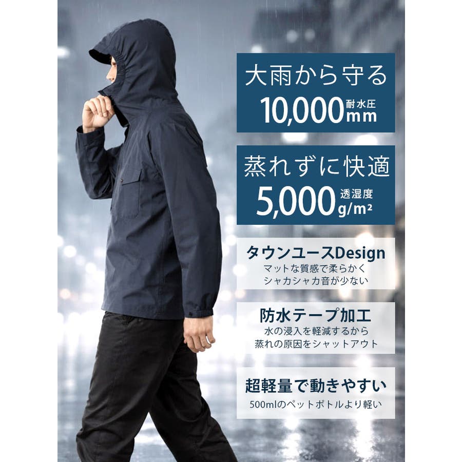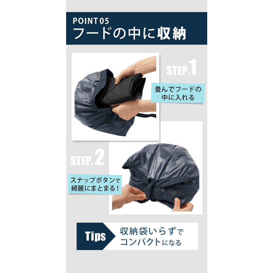 ・フードは長つば構造を採用、髪や顔を雨から守り、視界を確保。使わないときは丸めて襟裏のコードをボタンで固定すれば立襟に。
