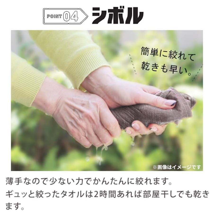 ・少ない力でカンタンに絞れる薄手の生地感。ギュッと絞って、約2時間の部屋干しで乾く速乾性も魅力。