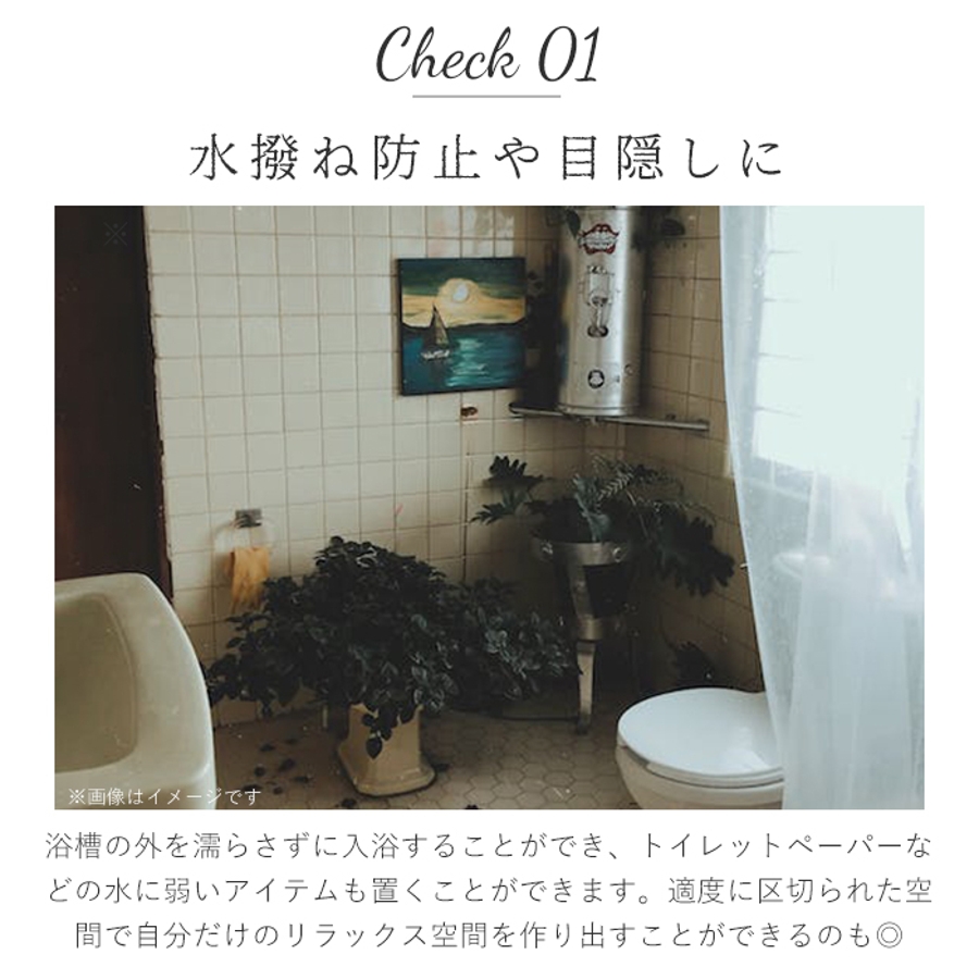 ・ユニットバスの水撥ね防止や目隠しに使えるシャワーカーテンが登場。