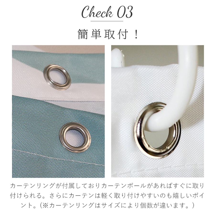 ・カーテンリングが付属しておりカーテンポールがあればすぐに取り付けられる。さらにカーテンは軽く取り付けやすいのも嬉しいポイント。(※カーテンリングはサイズにより個数が違います。)