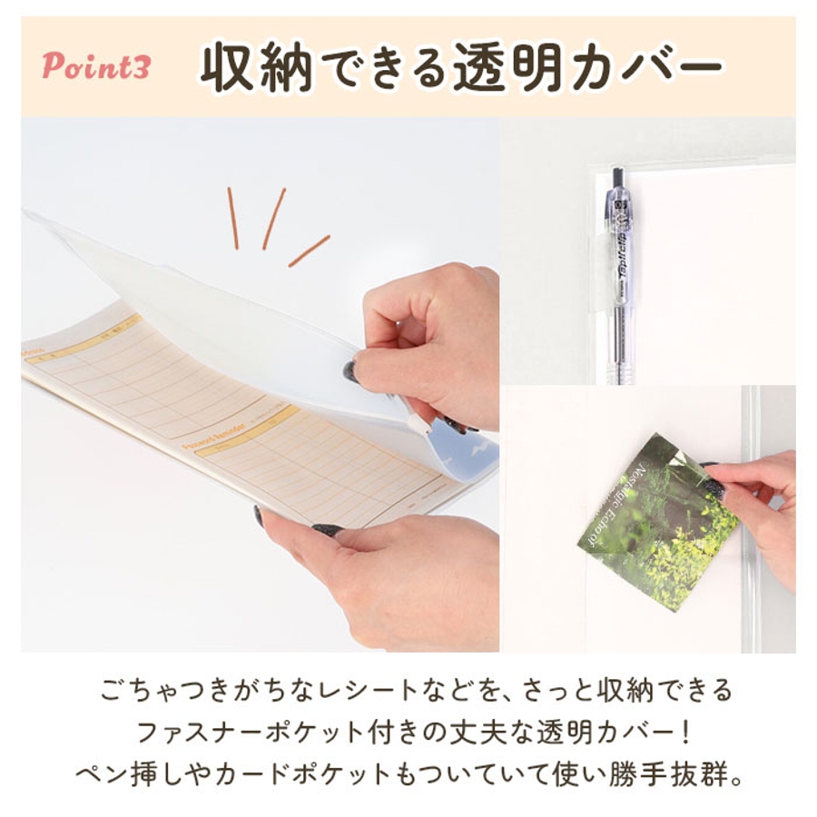 ・丈夫な透明カバーには、ペン挿しやカードポケット、レシートなどを収納しておけるファスナーポケット付き!