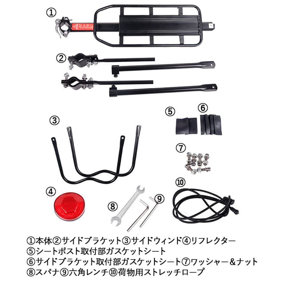 ・セット内【(1)本体・(2)サイドブラケット×2・(3)サイドウィンド×2・(4)リフレクター・(5)シートポスト取付部ガスケットシート×2・(6)サイドブラケット取付部ガスケットシート×4・(7)ワッシャー&ナット×6・(8)スパナ・(9)六角レンチ×2・(10)荷物用ストレッチロープ)】