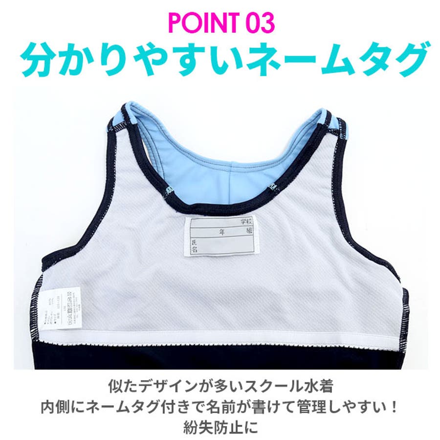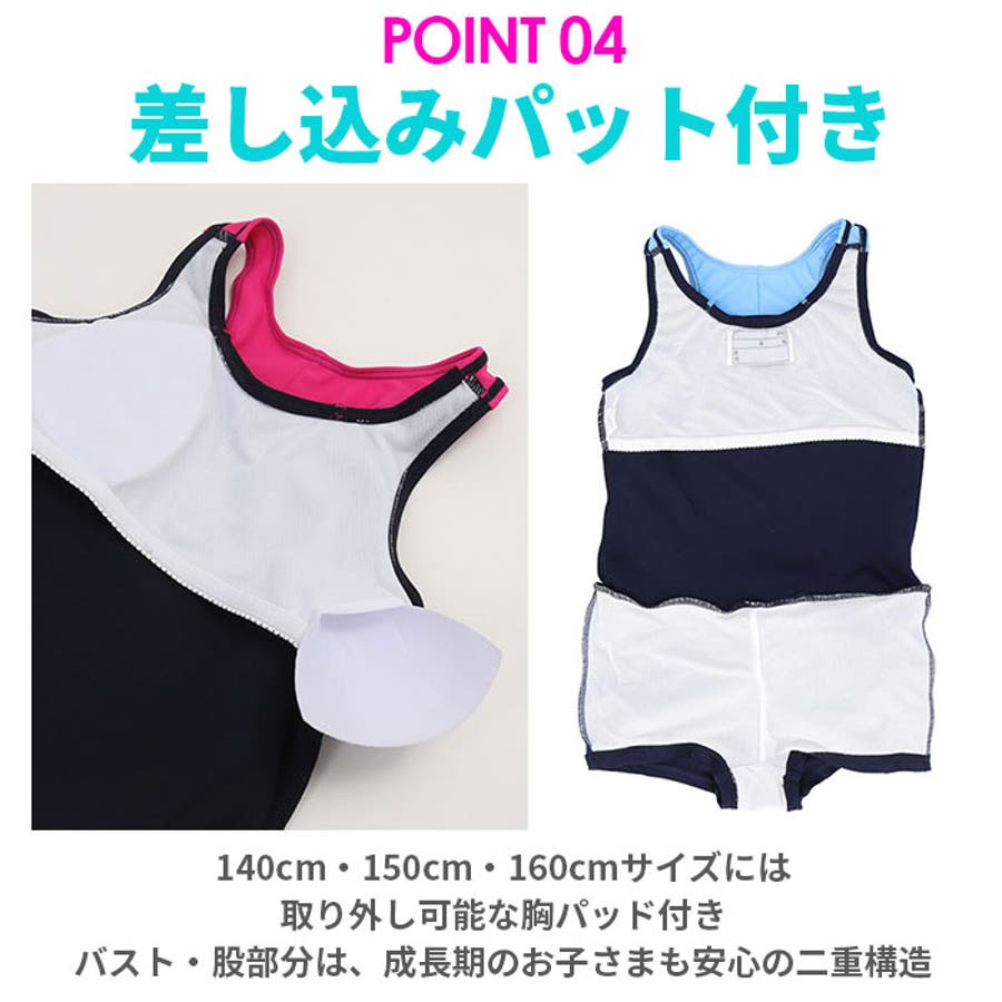 ・バスト・股部分は、成長期のお子さまも安心の二重構造。140cm・150cm・160cmサイズには取り外し可能な胸パッド付きで、バストを優しくカバー。