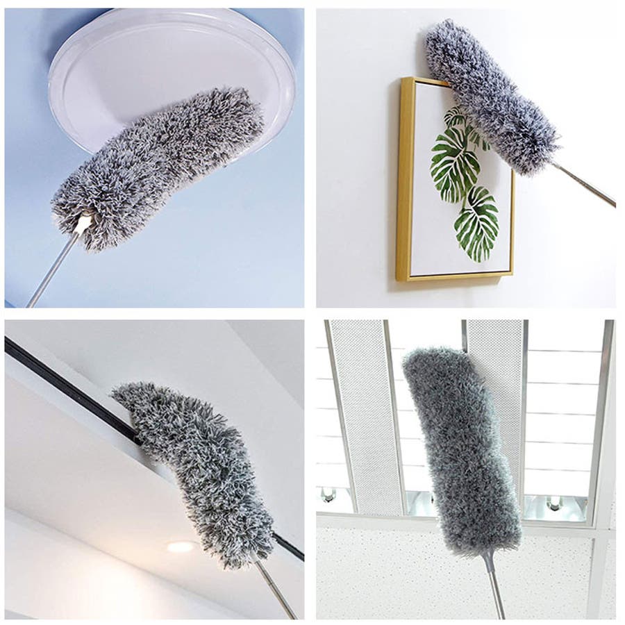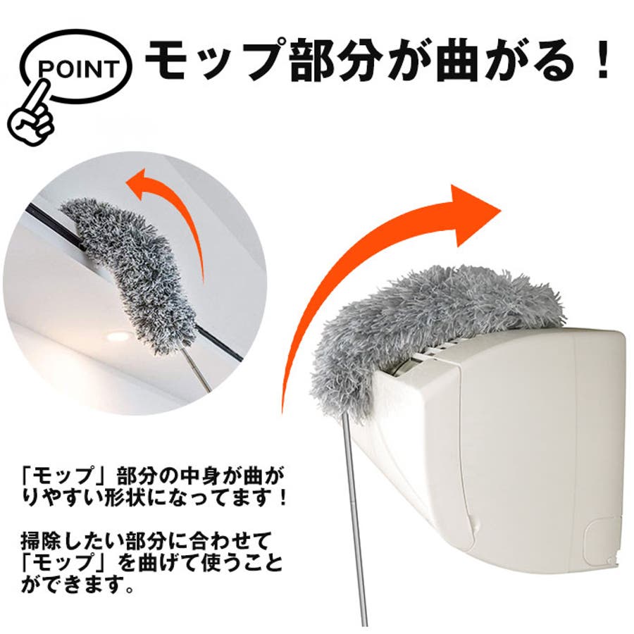 ・先端のモップ部分が自在に曲がるので、低い場所からは見えないエアコンの上や照明の傘までスッキリキレイに♪