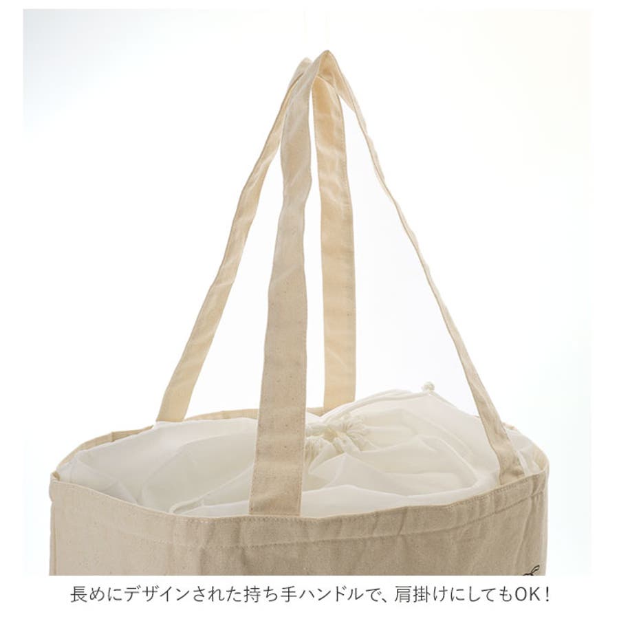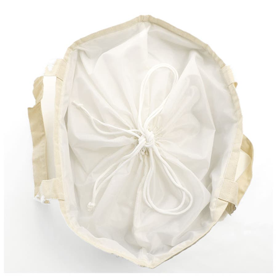・バッグの開口部は、お買い物した食材や日用品など、中身が見えない巾着式。口を紐でキュッとしぼれば、たっぷりお買い物をしたときも食材が飛び出さず安心。