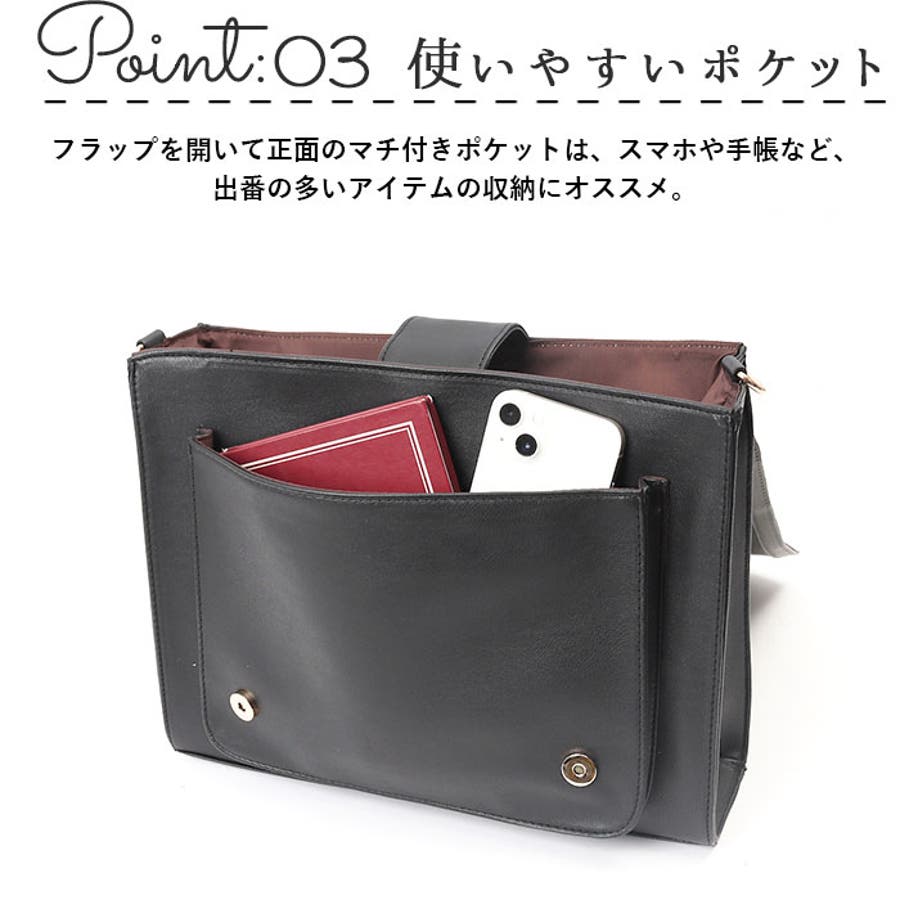 ・フラップを開いて正面のマチ付きポケットは、スマホや手帳など、出番の多いアイテムの収納にオススメ。