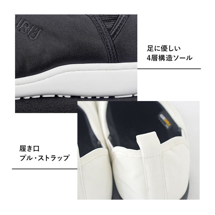 ※アッパーとソールで色を切り替えたシンプルなモノトーンが清潔感のある足元を演出。履き口の「SUBU」のロゴ刺繍が控えめなワンポイント。