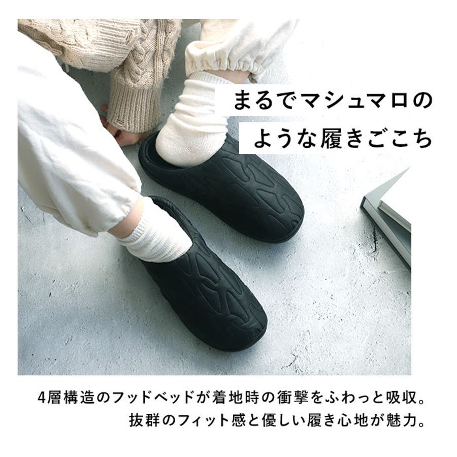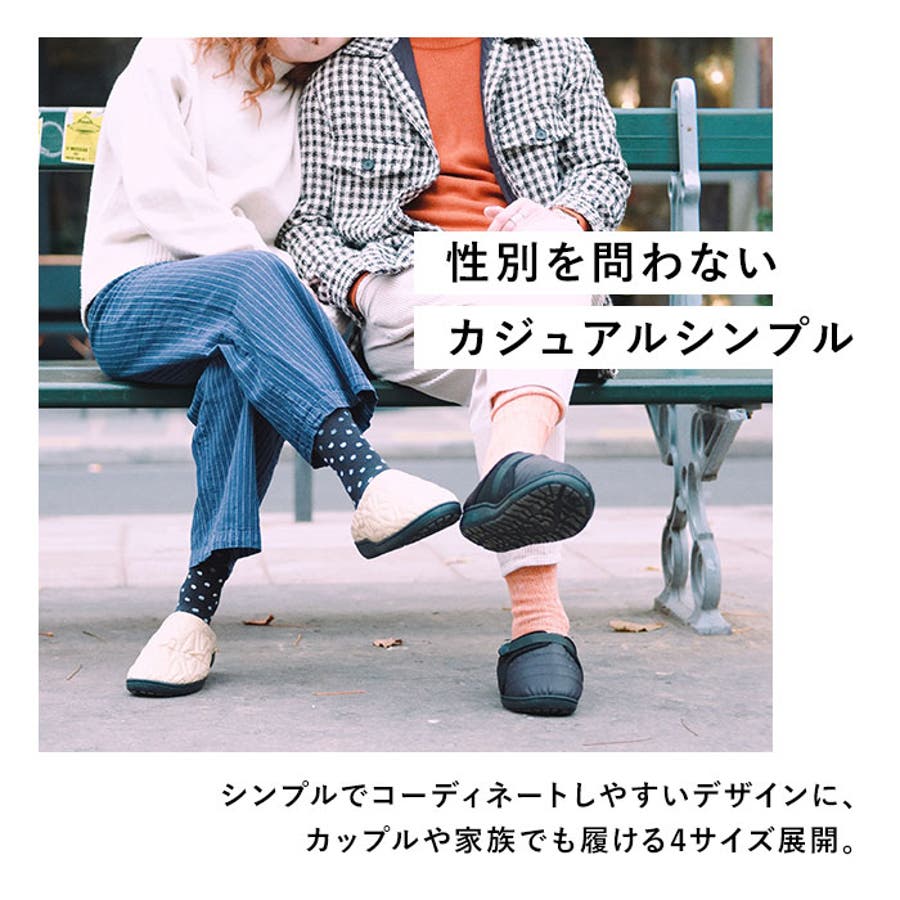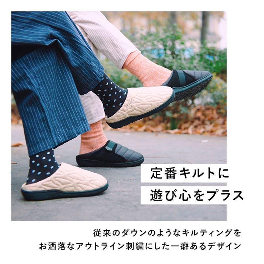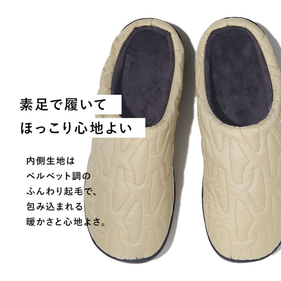 ・ダウンジャケットのようなキルティング素材で足元をふんわり包み、冷え込む朝も暖かな履き心地。