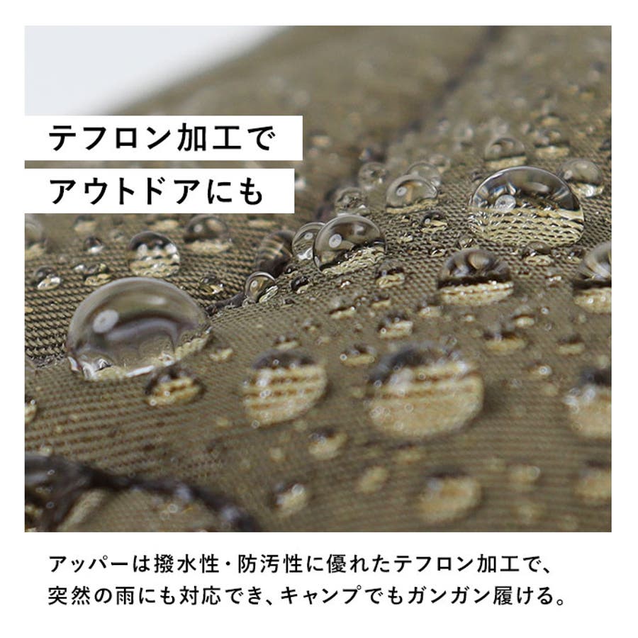 ・アッパー生地は、はっ水性・防汚性に優れたテフロン加工を施し、突然の雨やアウトドアでも安心。