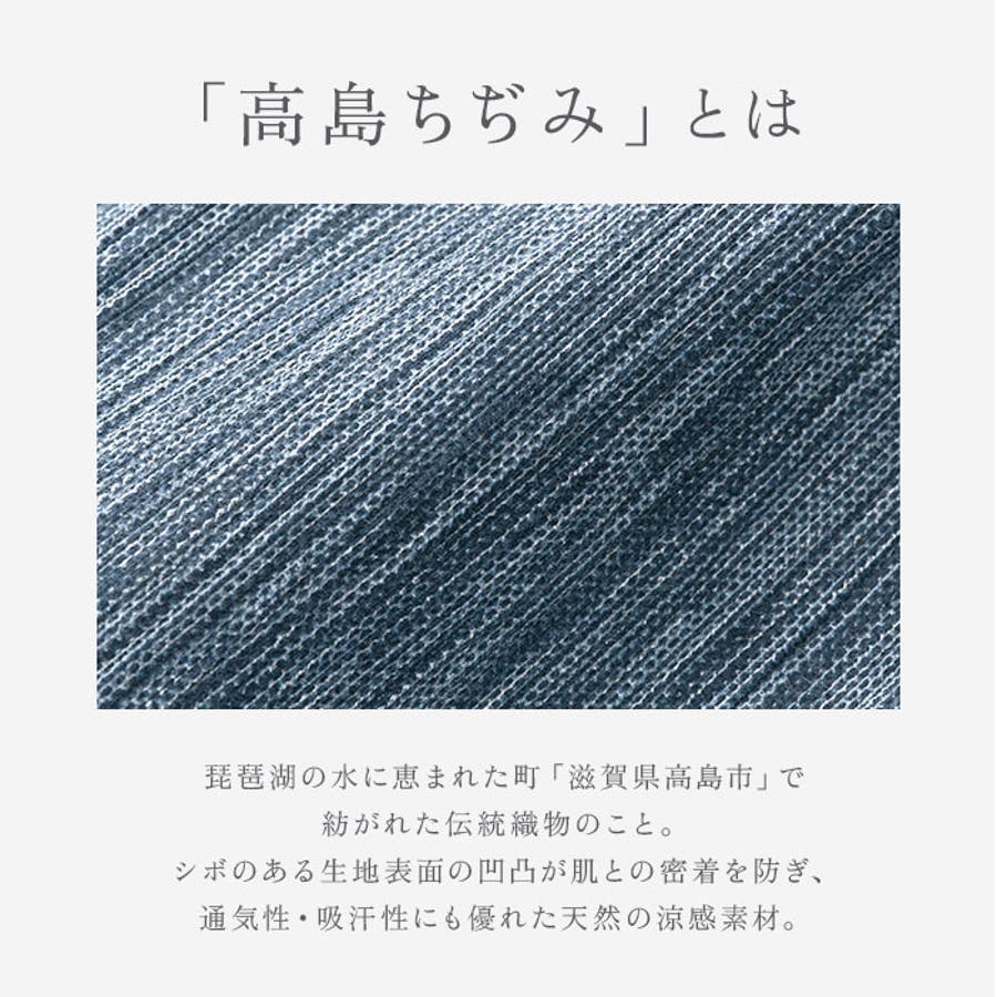 「高島ちぢみ」とは、琵琶湖の水に恵まれた町「滋賀県高島市」で紡がれた伝統織物のこと。シボのある生地表面の凹凸が肌との密着を防ぎ、通気性・吸汗性にも優れた天然の涼感素材。