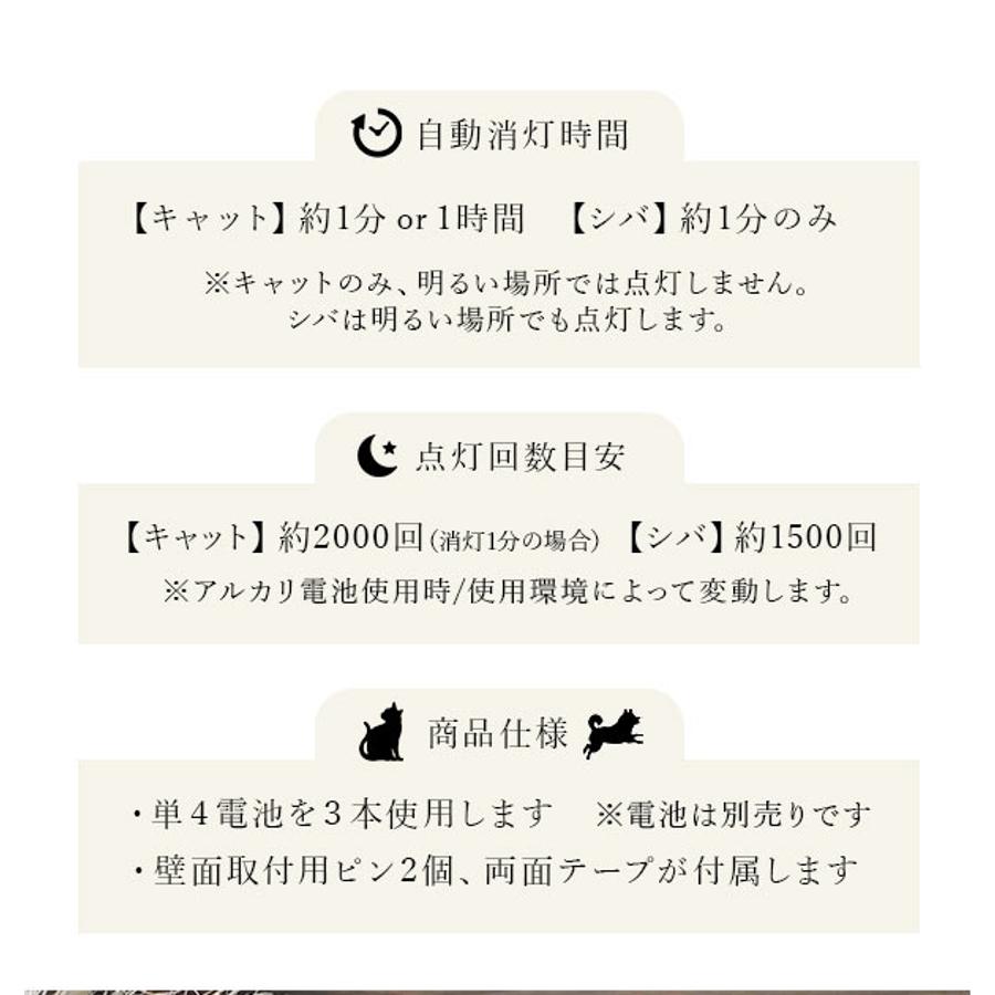 ※キャットのみ、明るい場所では点灯しません。シバは明るい場所でも点灯します。