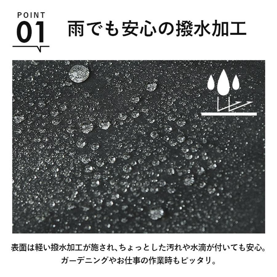 ・表面は軽いはっ水加工が施され、ちょっとした汚れや水滴が付いても安心◎ガーデニングやお仕事の作業時もピッタリ。