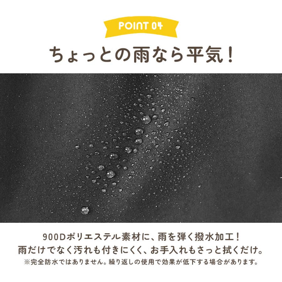 ・900Dポリエステル素材に、汚れや水滴を弾きやすい撥水加工を。お手入れも拭き取るだけ。