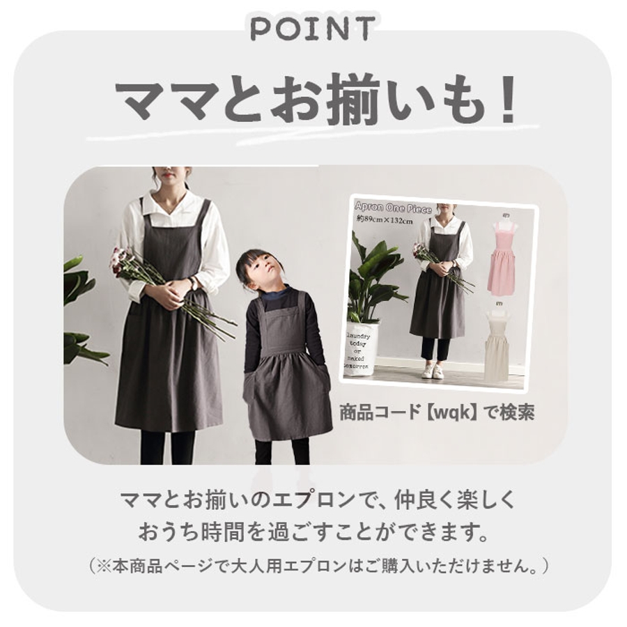 ・ママとお揃いのエプロンで、仲良く楽しいおうち時間を♪親子でリンクコーデもオススメ。(※同じデザインの大人用エプロン(wqk)は、別の商品ページでお買い求めいただけます。本商品ページで大人用エプロンはご購入いただけません。)
