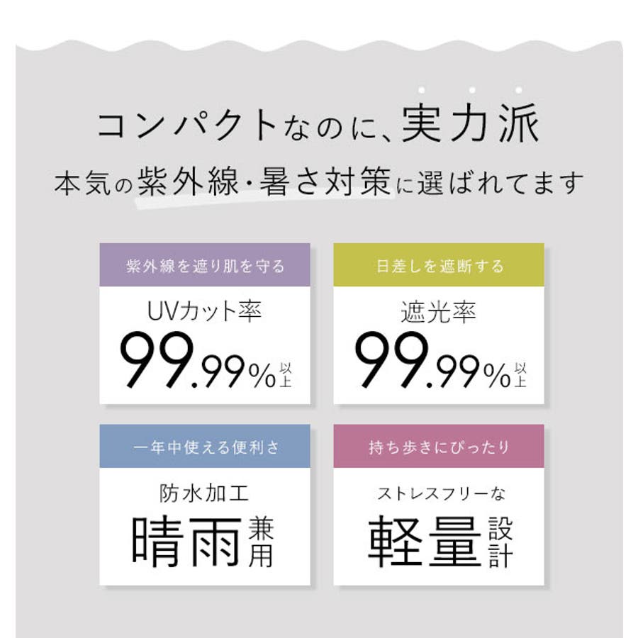 ※この製品は紫外線遮蔽、遮光、遮熱効果を目的とした日傘です。また、生地にはPUコーティングを施しており、防水効果もありますので、雨の日にもご使用いただけます。