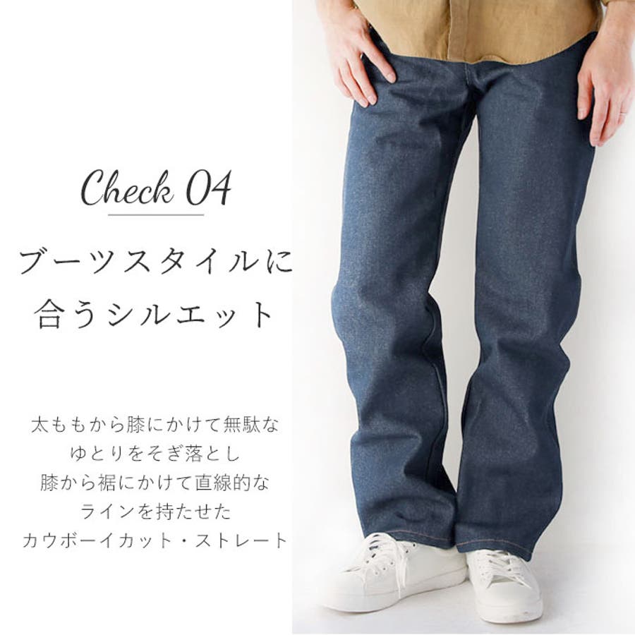 ・シャツインのカウボーイスタイルに倣い、深めの股上とやや余裕のある腰周り。