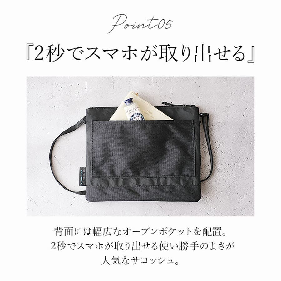 ・身体に当たる背面側にもバッグの幅いっぱいのオープンポケットがあり、大切なスマホやコインコインケースの収納にオススメ。