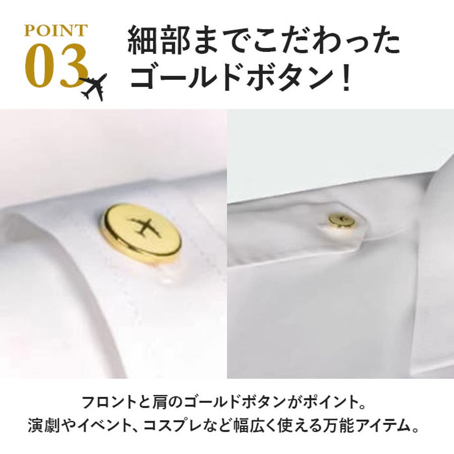 ・フロントと肩のゴールドボタンがポイント。肩章&ピンバッジでリアル感UP、写真映えも◎
