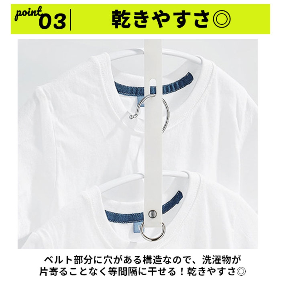 ・ベルト部分に穴がある構造なので、洗濯物が片寄ることなく等間隔に干せる!乾きやすさ◎