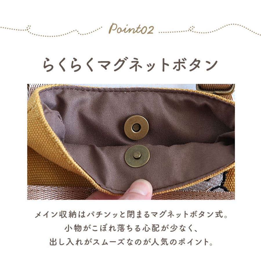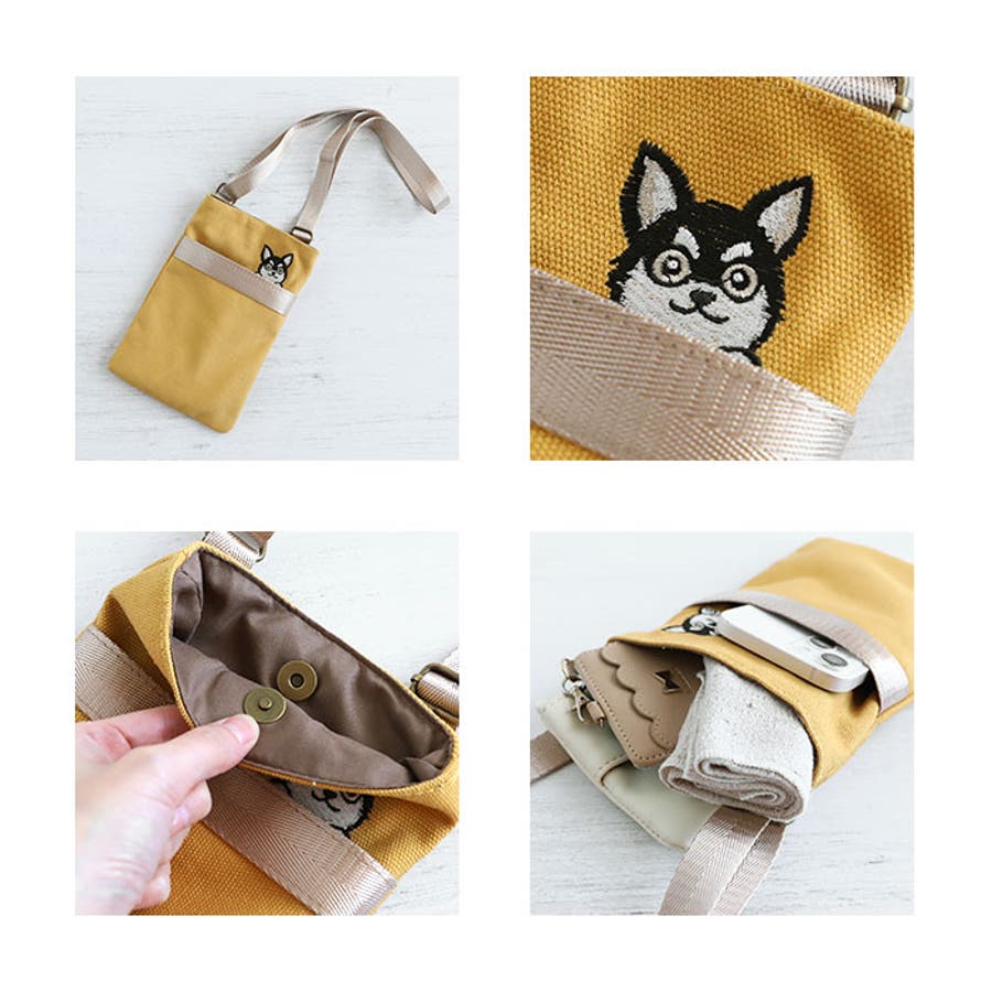 ・ワンちゃん・猫ちゃんの刺繍をあしらった前面オープンポケットは、スマホなど出番の多いアイテムの収納にオススメ。