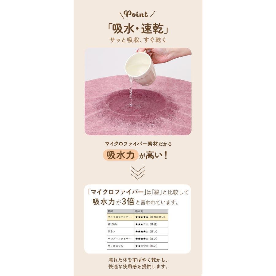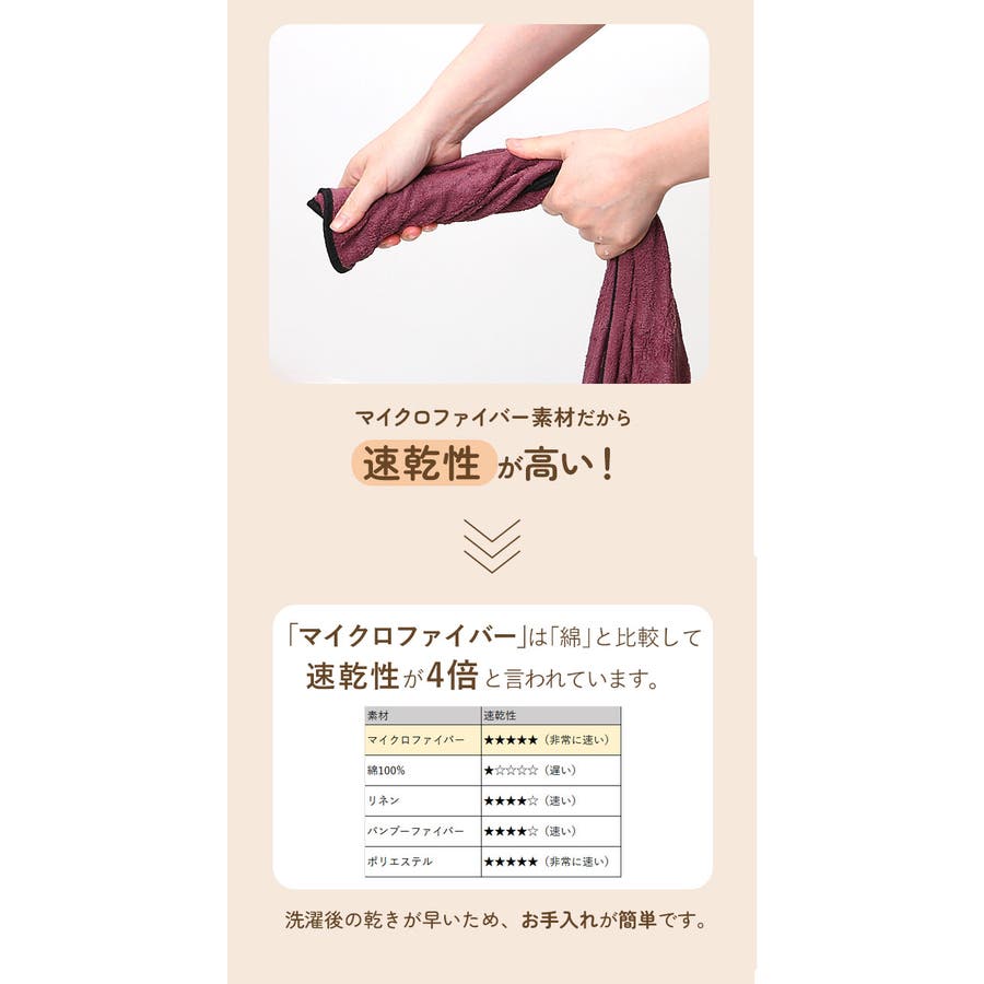 ・吸水性と速乾性に優れたマイクロファイバー素材を使用。80cm×130cmの大判サイズで身体をすっぽり包み込んで、簡単タオルドライ。