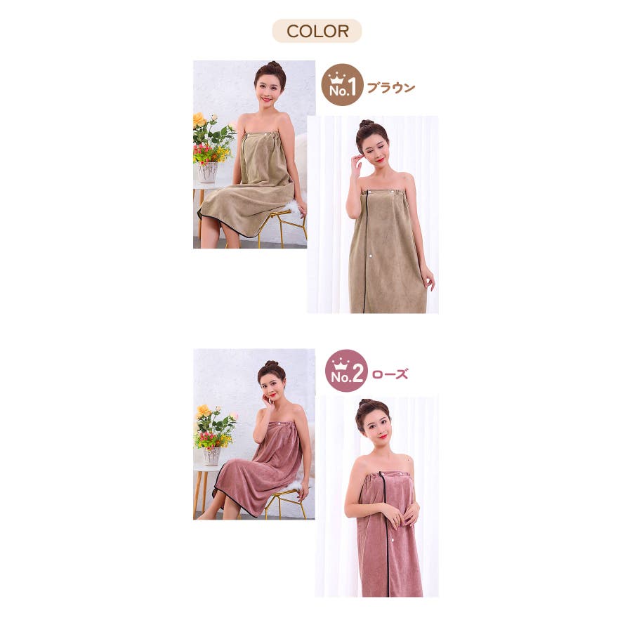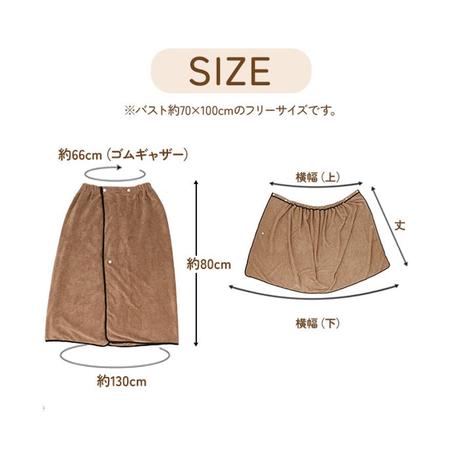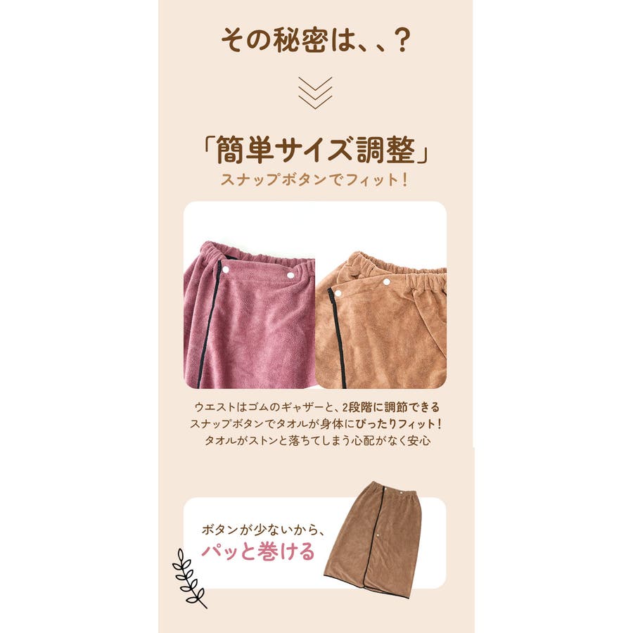 ・ウエストはゴムのギャザーと、2段階に調節できるスナップボタンでタオルが身体にぴったりフィット!タオルがストンと落ちてしまう心配がなく安心。