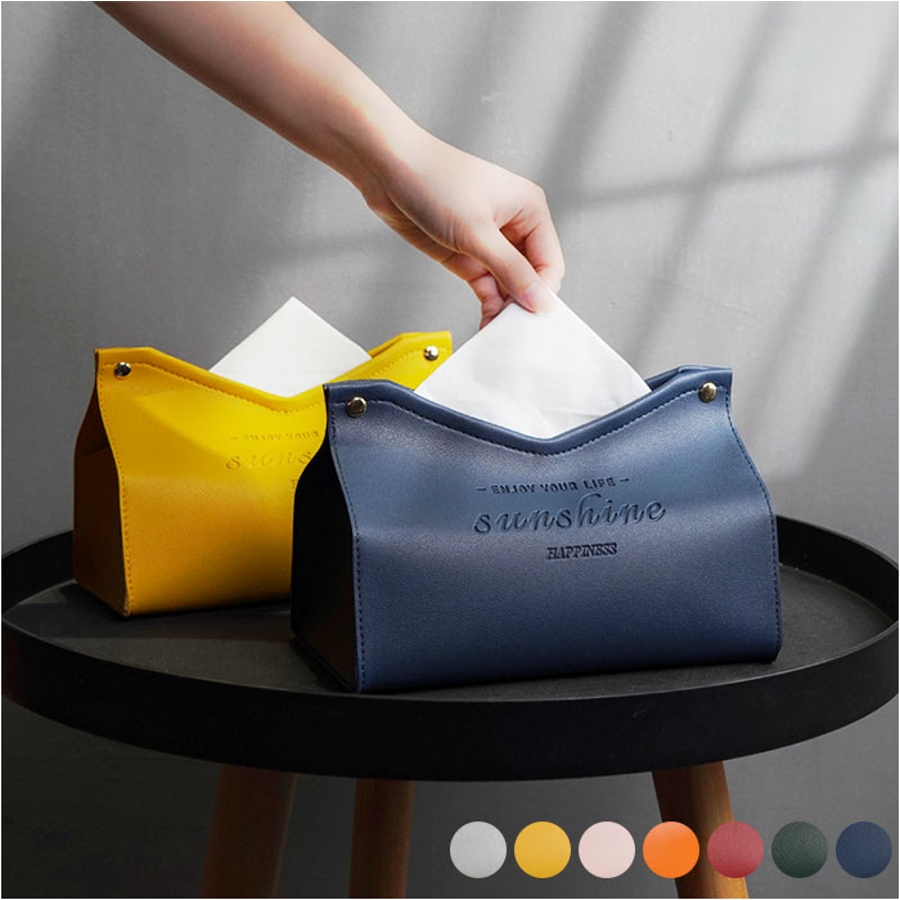 ・カラフルなフェイクレザー生地に、控えめに型押しされた「-ENJOY YOUR LIFE- Sunshine」のセンテンスがワンポイント。カバーを変えるだけで、生活感が出てしまいがちなティッシュがグッとエレガントに♪