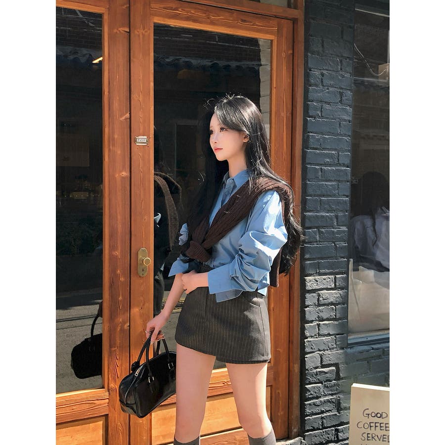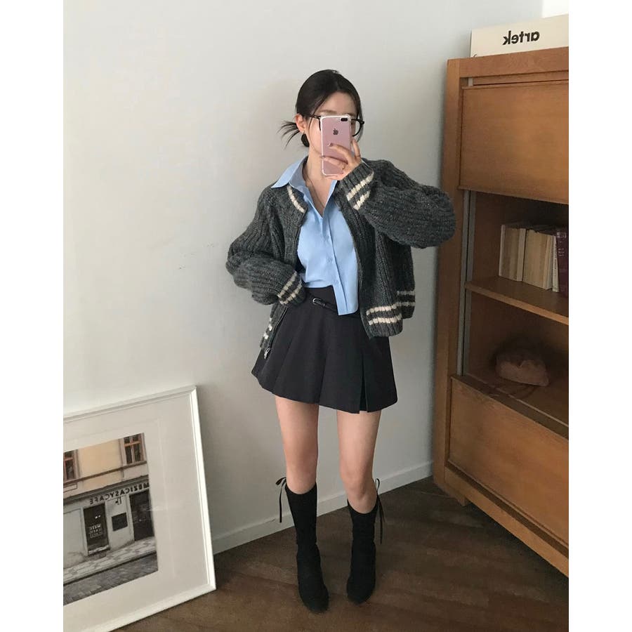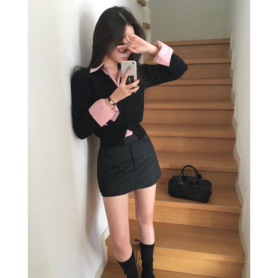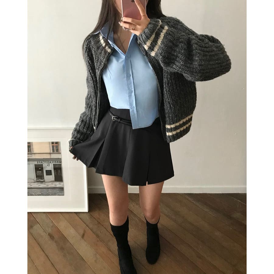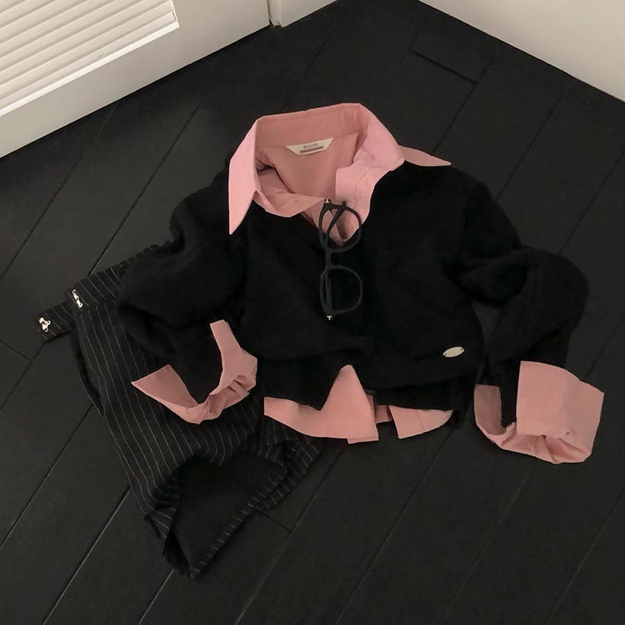 レイヤードするのに良いセミクロップ丈でニットベストと、ジャケットの中のコーデに良い