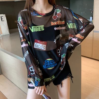 ★ Tシャツ カットソー ロンT インナー 韓国ファッション ストリートファッション B系・ヒップホップ ダンス 10代 20代 30代 Z世代 女性・レディース 春 夏 秋 冬 オールシーズン オーバーサイズ 大きいサイズ ゆったり ルーズ ミディ丈 プリント 長袖 クルーネック モノトーン カラフル 総柄 ロゴ