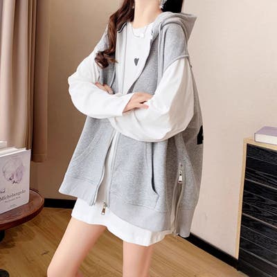★ ジップパーカー カットソー 羽織り 韓国ファッション ストリートファッション B系・ヒップホップ ダンス 10代 20代 30代 Z世代 女性・レディース 春 秋 冬 オーバーサイズ 大きいサイズ ゆったり ジップアップ スリット フード ノースリーブ モノトーン 無地 ロゴ