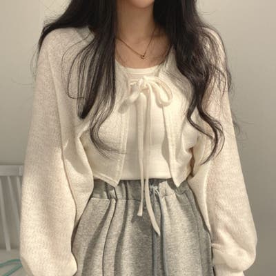 シンプルだけどさりげなく可愛い、リボン付きデザインのカーディガン。