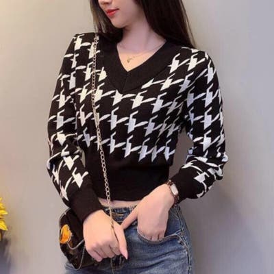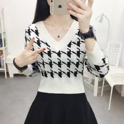 ★ プルオーバー カットソー ニット・セーター 韓国ファッション カジュアル きれいめ 大人っぽ 10代 20代 30代 Z世代 女性・レディース 春 秋 冬 あったかい タイト 細身 ショート丈 長袖 Vネック モノトーン 総柄 ニット