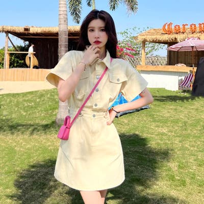 ★ ジャンスカ ミニワンピ ひざ丈ワンピ シャツワンピ 韓国ファッション カジュアル ベーシック ガーリー 10代 20代 30代 Z世代 女性・レディース 春 夏 秋 Aライン 台形 大きいサイズ ミニ丈 ウエストゴム スリット 半袖 くすみカラー パステルカラー 無地 デニム ツイル